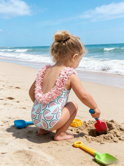 Baby Girls Cute One-Piece Swimsuit – Watermelon Print with 3D Ruffle Straps